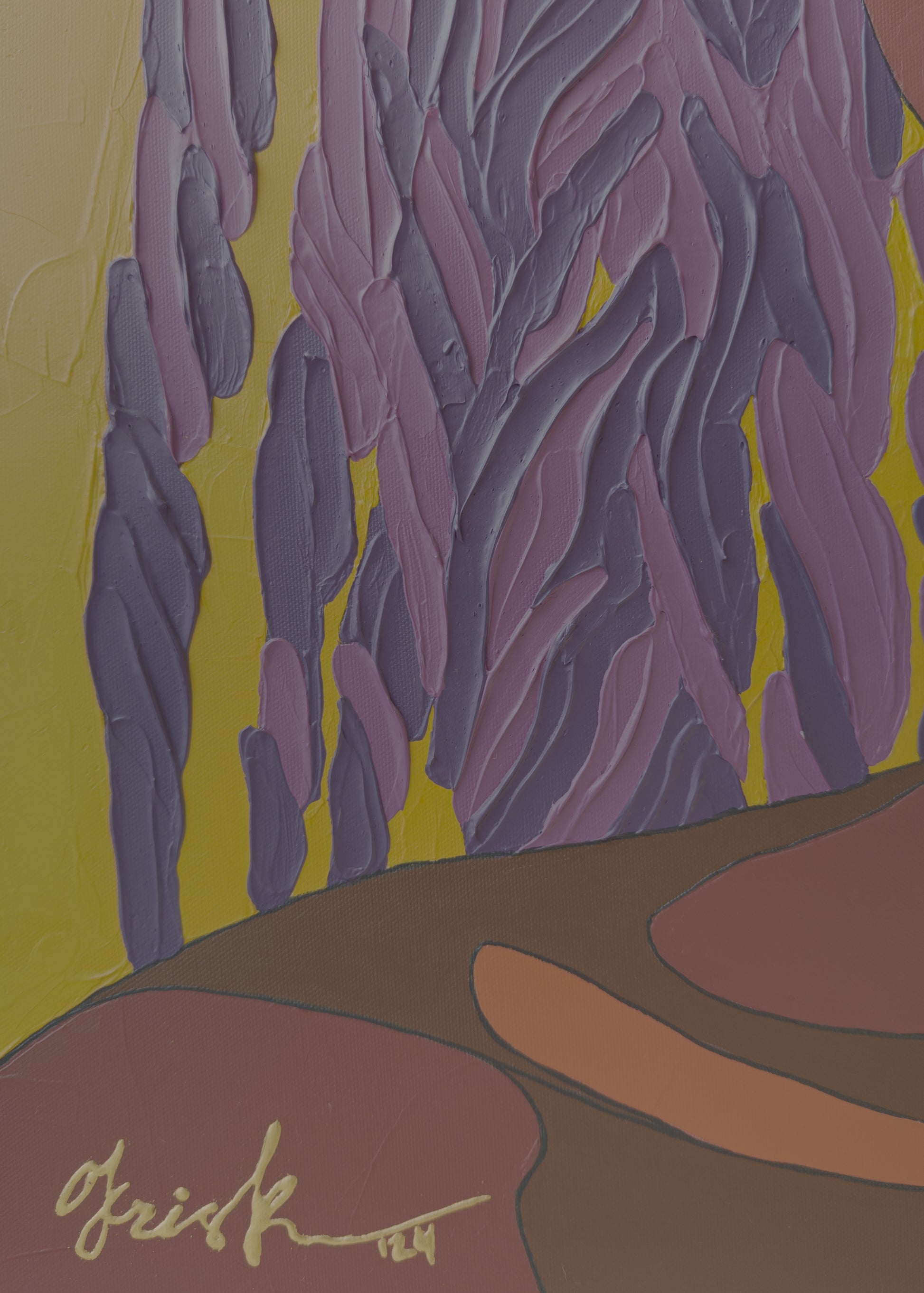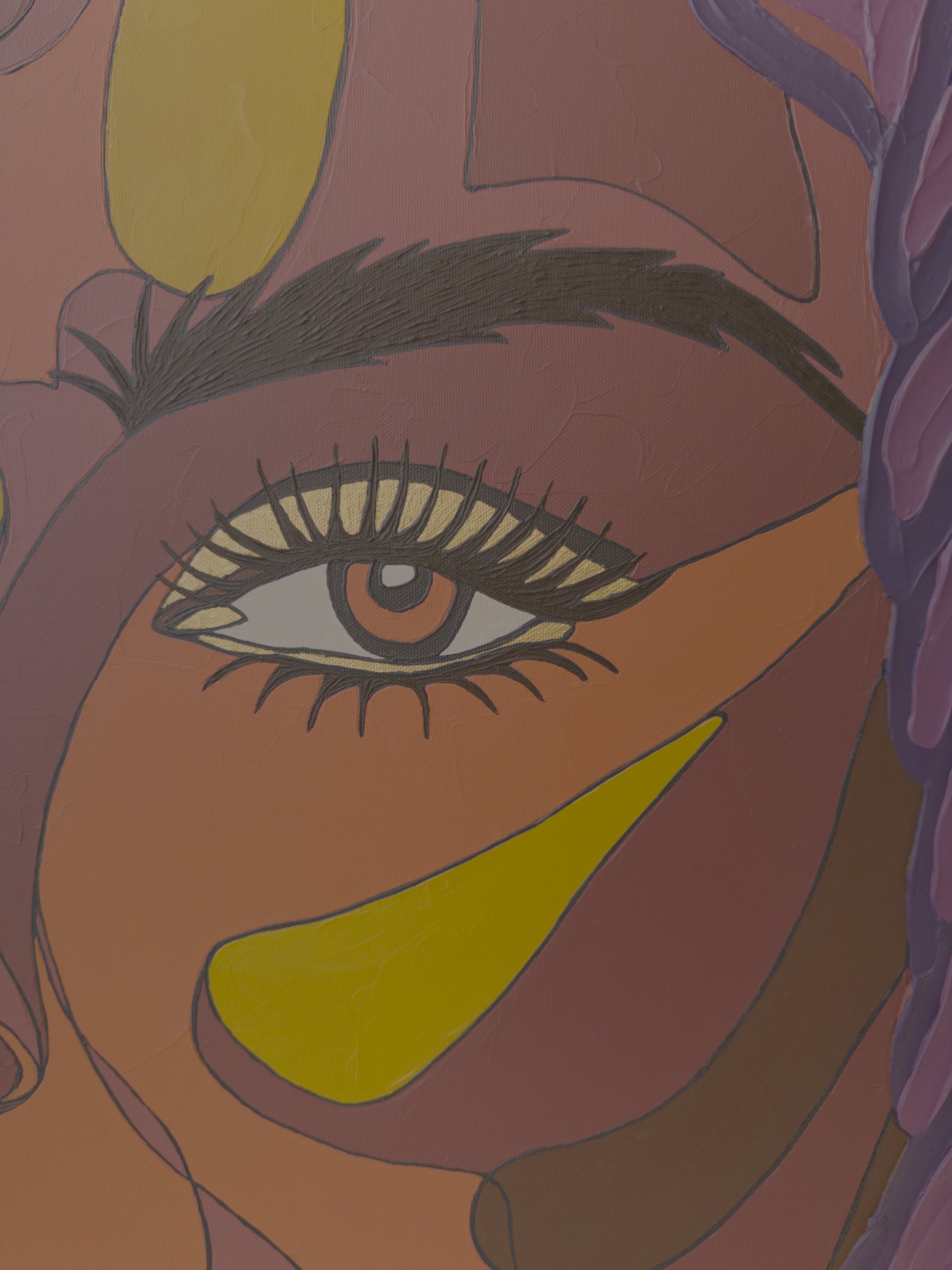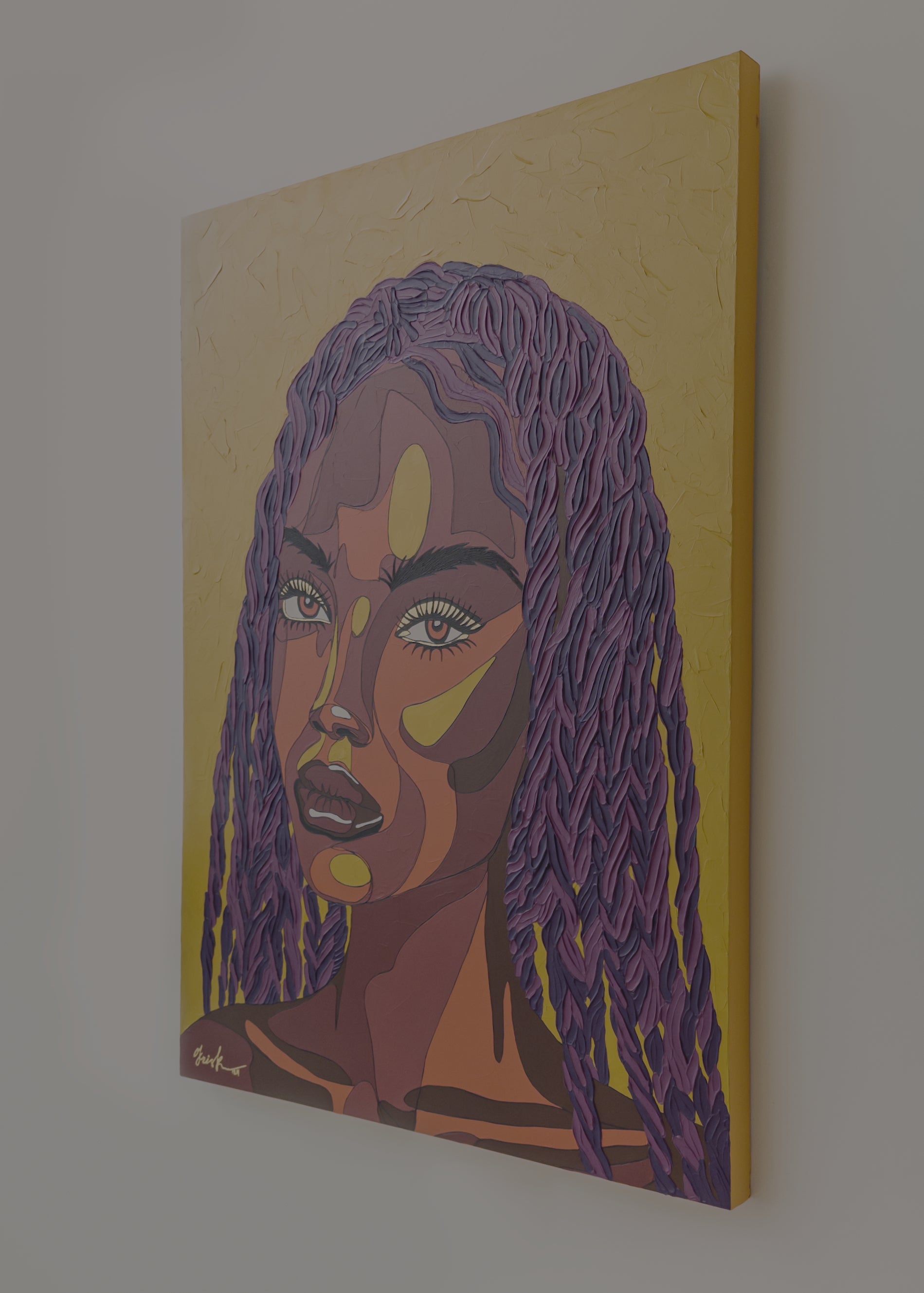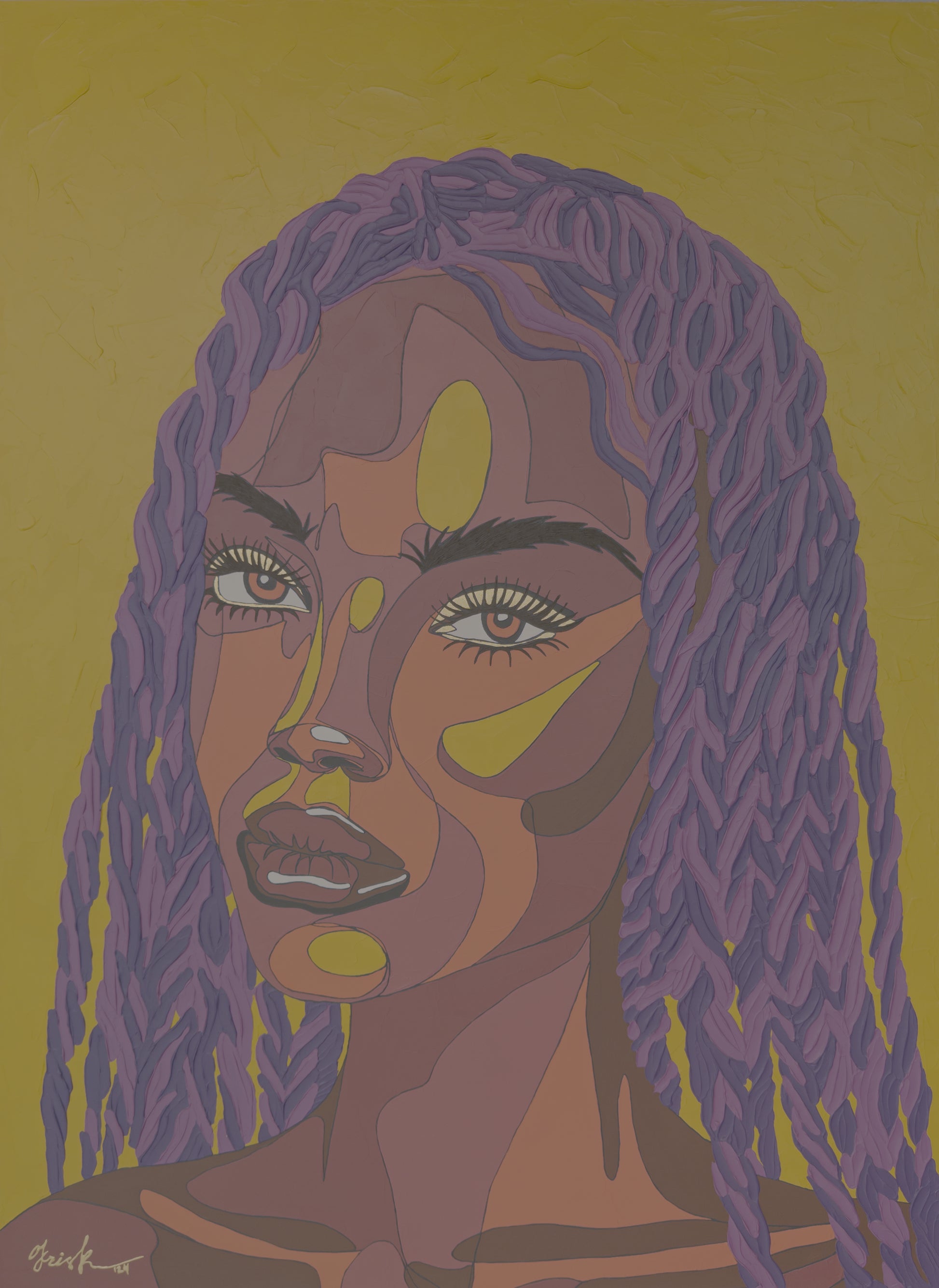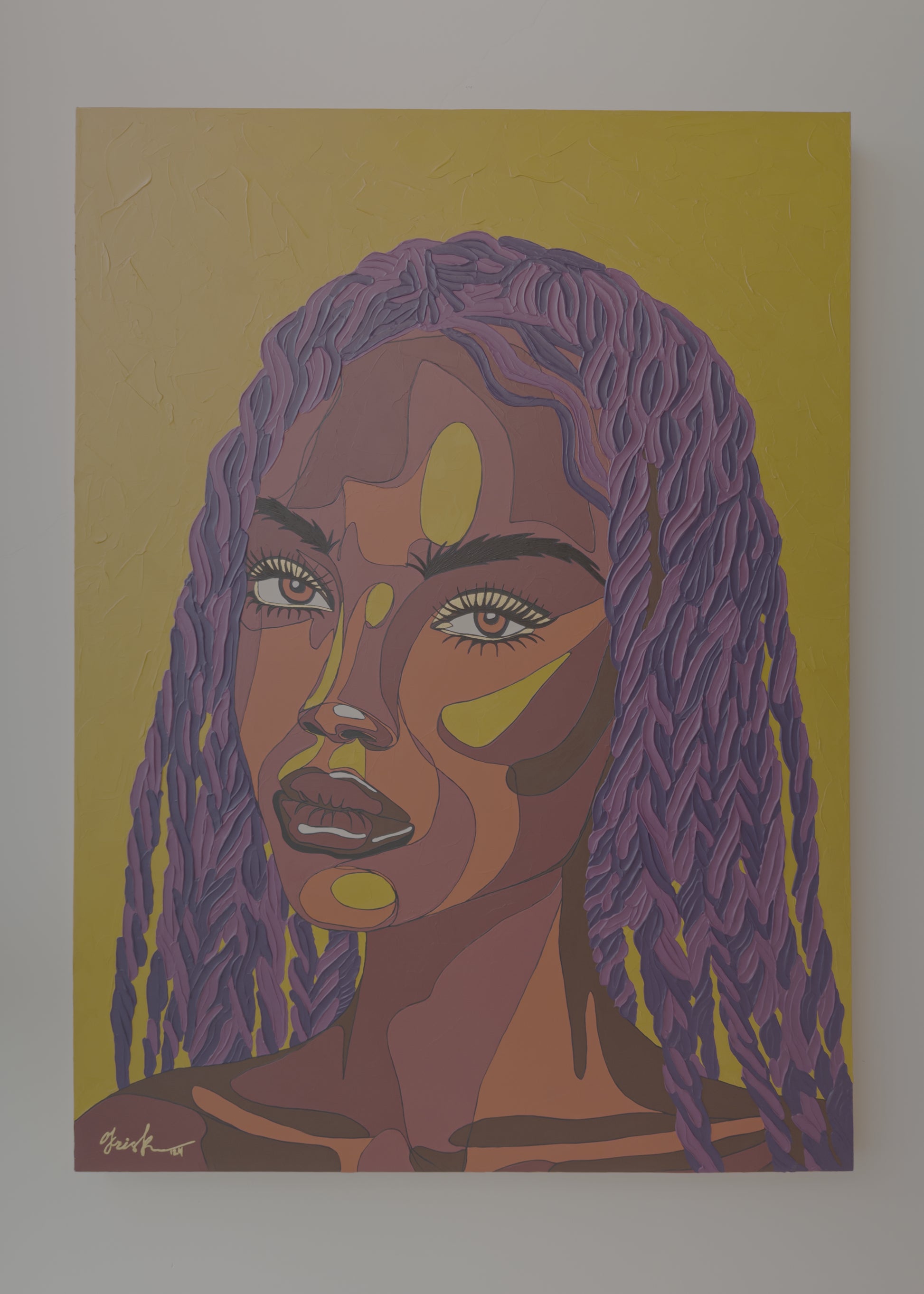 Kris K often challenges herself with unexpected or unconventional color combinations - sometimes deliberately choosing palettes she initially doubts. This process leads to bold, impactful results. Her use of non-naturalistic skin tones - such as purples, pinks, and greens - creates a visual language that invites universal connection.