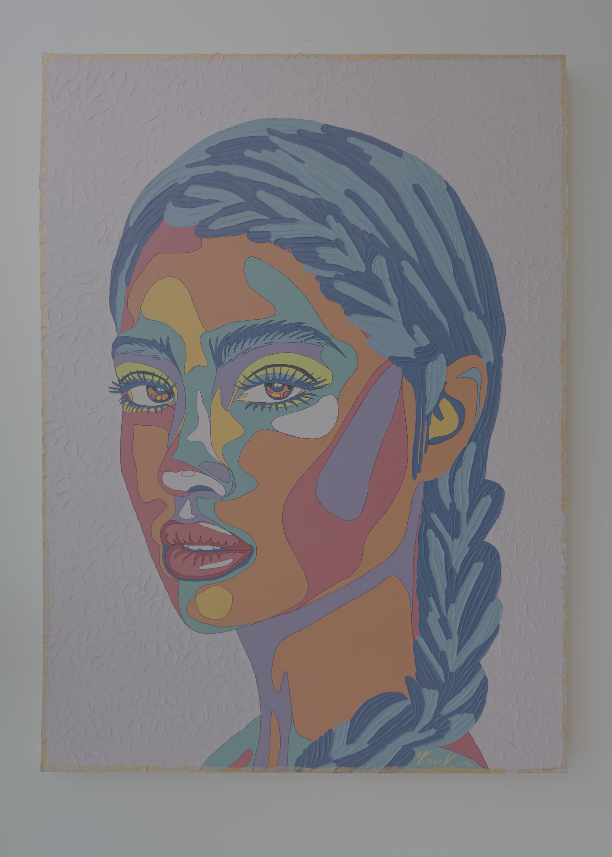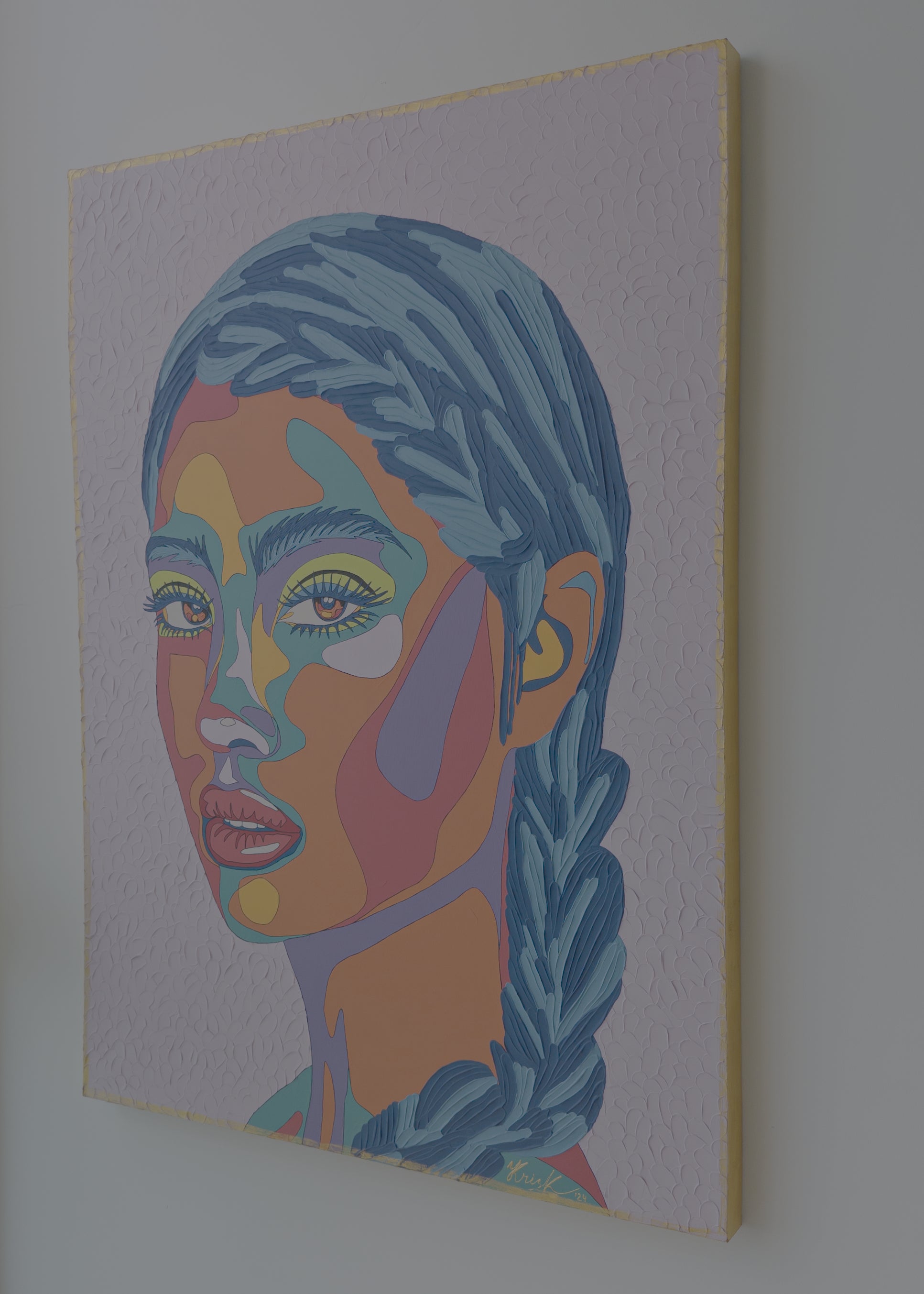 Kris K often challenges herself with unexpected or unconventional color combinations - sometimes deliberately choosing palettes she initially doubts. This process leads to bold, impactful results. Her use of non-naturalistic skin tones - such as purples, pinks, and greens - creates a visual language that invites universal connection.